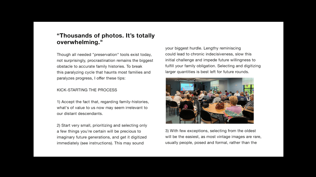 - Start very small, prioritizing and selecting only a few things you’re certain will be precious to imaginary future generations, and get it digitized immediately (see instructions). This may sound your biggest hurdle. Lengthy reminiscing could lead to chronic indecisiveness, slow this initial challenge and impede future willingness to fulfill your family obligation. Selecting and digitizing larger quantites is best left for future rounds.